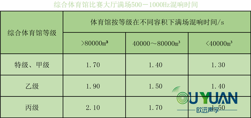 根據(jù)《體育建筑設(shè)計規(guī)范》,綜合體育館各等級滿場混響時間要求如下